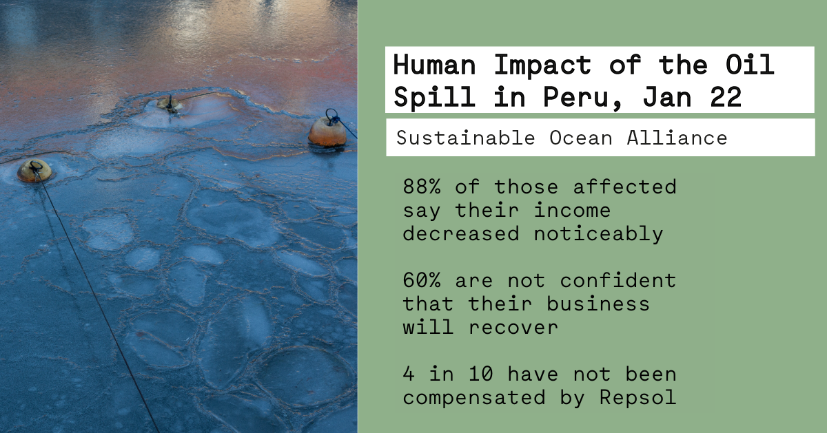 Sustainable Ocean Alliance: Peruvian Oil Spill Disaster Response. On January 15th 2022, almost 12,000 barrels of crude oil from Repsol spilled in Callao, Peru. Less than three months later, we worked with Sustainable Ocean Alliance and ConCiencia Marina to interview the fishermen and merchants affected by the oil spill. For the first time in Peru’s history, a lawsuit will be heard against a transnational company for environmental damages.