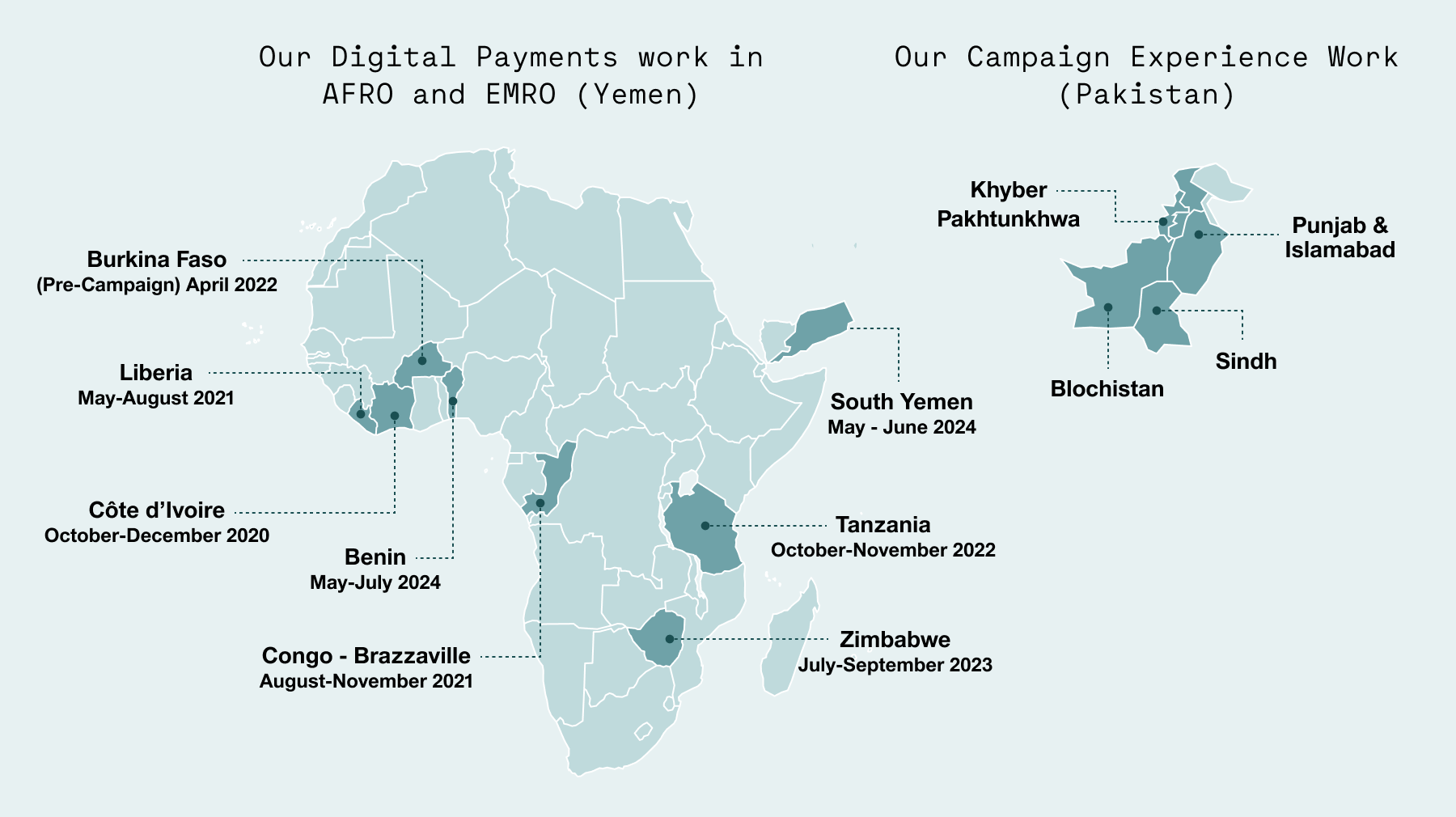 Delays and challenges in vaccinator payments have been identified as a common issue affecting polio campaign quality. We surveyed vaccinators who participated in the polio campaigns in Burkina Faso, Cote d’Ivoire, Liberia, Republic of the Congo, Pakistan, Tanzania and Zimbabwe in collaboration with the Ministry of Health of the countries and the World Health Organization’s Digital Finance Team. The aim of these studies is to understand vaccinators’ experience with mobile money payments as well as how to ensure that payments are timely, complete, and convenient.