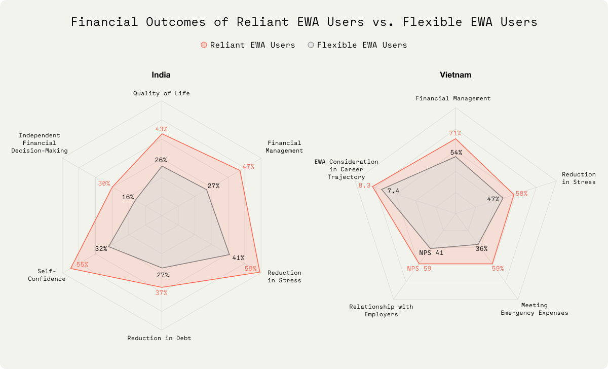 Users who report that they rely on EWA with each pay period (‘reliant users’) report greater financial stability, lower stress, and improved emergency preparedness compared to users who rely on EWA as needed (‘flexible users’).