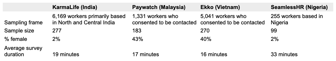 The sample of Paywatch users was primarily full-time employees working in the retail sector, while that of Ekko consisted of full-time employees working in manufacturing and facilities, KarmaLife’s sample comprised gig workers, and SeamlessHR’s was primarily full-time employees, with over half in blue-collar work.