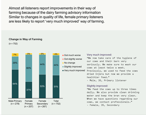The dairy farming advisory information is impactful and leads to tangible improvements with close to 8 in 10 listeners reporting some improvement in their quality of life, their way of farming, and cattle management. Top changes included improved cattle care, feed preparation, and feeding. Female primary listeners were less likely to report the depth of impact: the proportion reporting very much improved. Listeners who were able to apply the IVR advisory in full experienced a better impact than partial listeners. The top reasons they did not fully listen to the call were because they were at work, poor network connectivity, and language barriers. Female partial listeners reported lower levels of satisfaction and a high challenge rate compared to complete listeners.