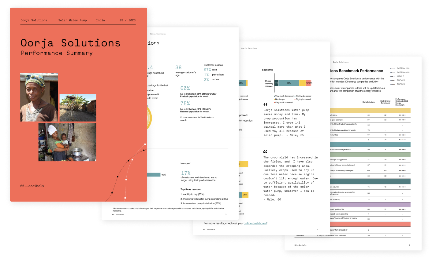 “Our experience with 60 Decibels has been excellent from start to finish. Gathering feedback in the field is often time-consuming and costly for impact companies. Being able to clearly identify our areas for improvement is invaluable. And being able to compare ourselves with the sector average is extremely useful, especially for convincing new financial partners.”