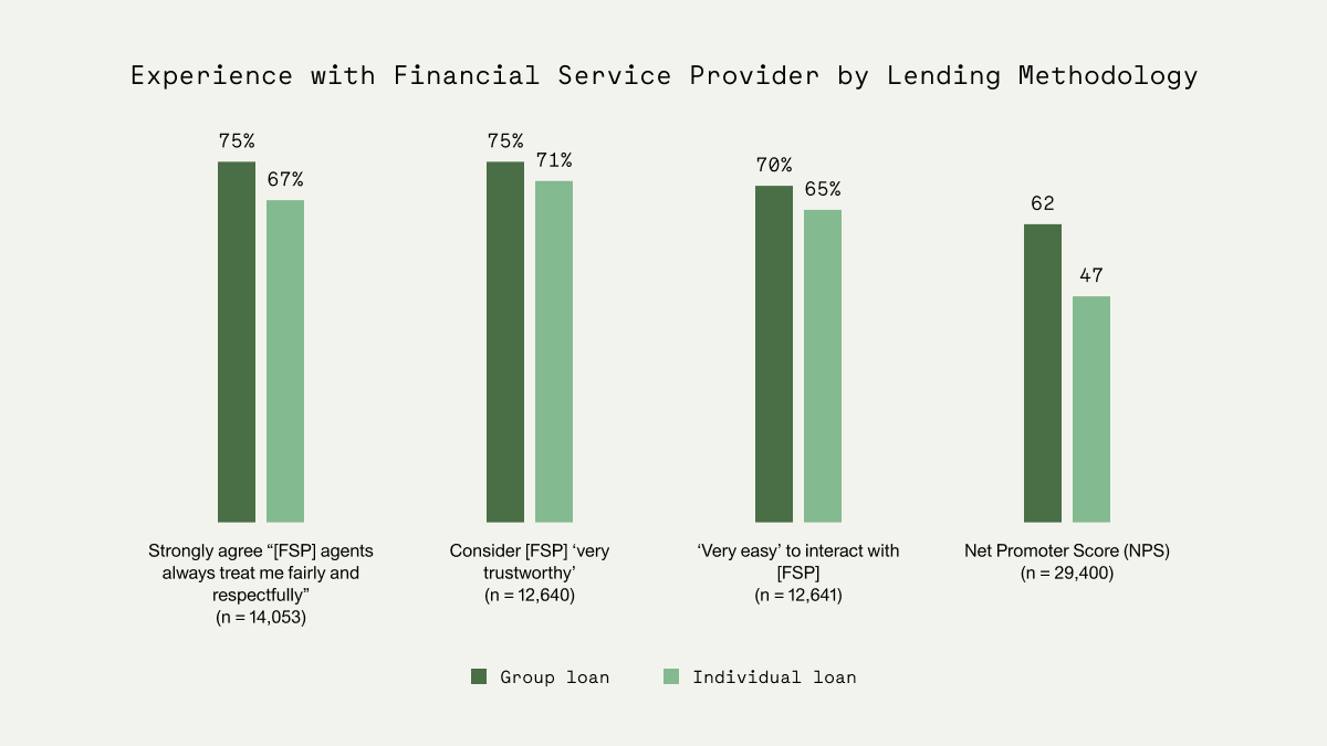 1. Clients with group loans report a better experience with their Financial Service Provider (FSP) than those with individual loans.