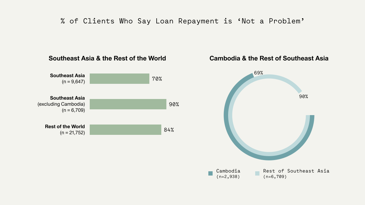 If we separate Cambodian clients from the rest of Southeast Asia, 69% of clients in Cambodia report their loan repayments are ‘not a problem’ and 90% of clients in the rest of Southeast Asia say the same.