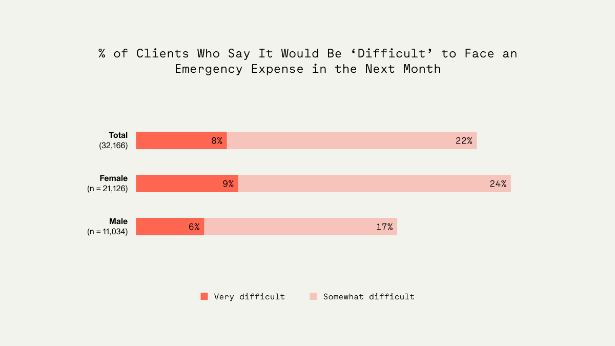 The Global Findex in 2021 reported that 32% of adults in developing countries say it would be ‘very difficult’ to fund an emergency expense* in the next month. Conversely, of the microfinance clients we spoke to only 8% say it would be ‘very difficult’ to come up with such an emergency expense.