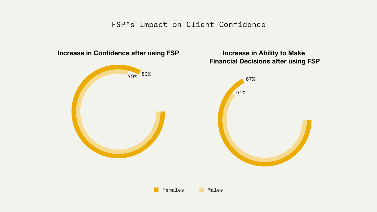 > 67% of women say their ability to make financial decisions without consulting their spouse or another adult has increased because of the FSP (compared to 61% males).